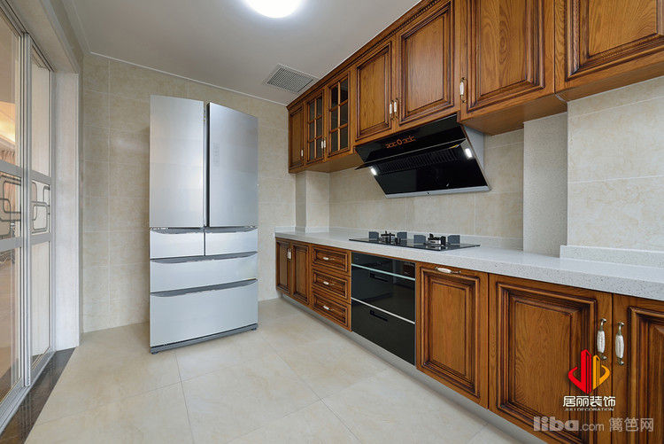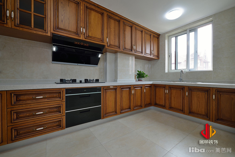 为衬托出厨房典雅高贵的气质,选用浅色作旧木纹橱柜装扮,暖色橱柜与浅色地板、相互映衬,彰显厨房的华丽和温馨。