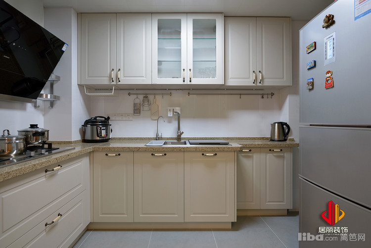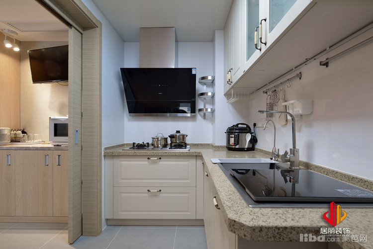 厨房延续了客餐厅的中灰色地砖,搭配白色的墙砖及橱柜,使这个空间整洁大方。灰色的台面与地砖交相呼应,让厨房空间更显灵动。