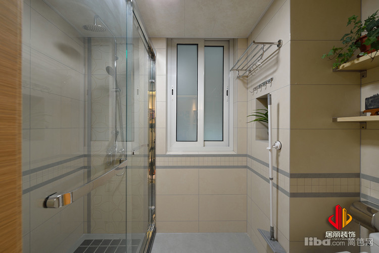 淋浴区与马桶区干湿分离,地面延用了客厅的灰色系地砖,搭配墙面的米色,白色的洁具让整个空间简约时尚。