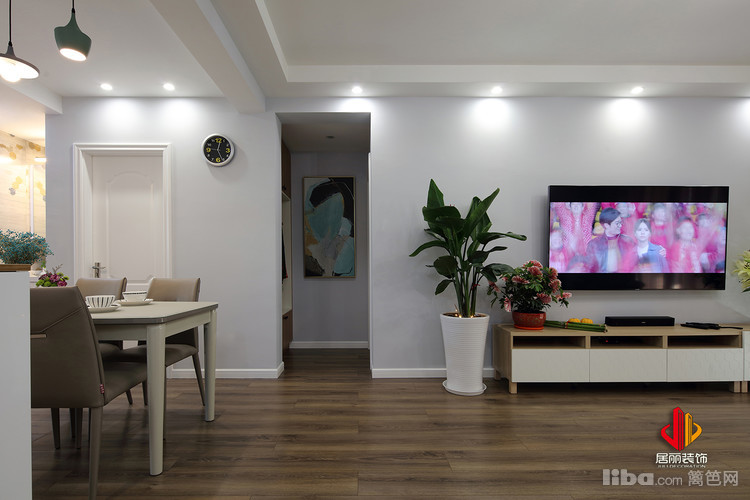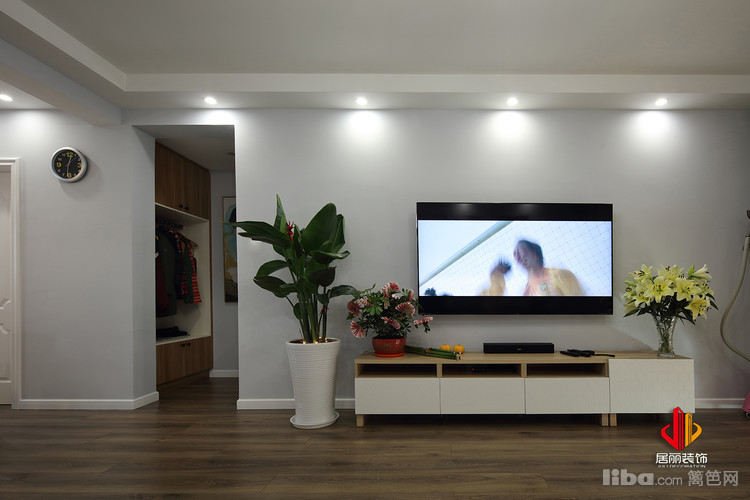 留白的电视背景墙,不做过多修饰。白色原木色拼接电视柜,简洁实用,也让白墙不至于单调。