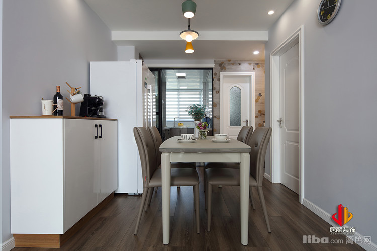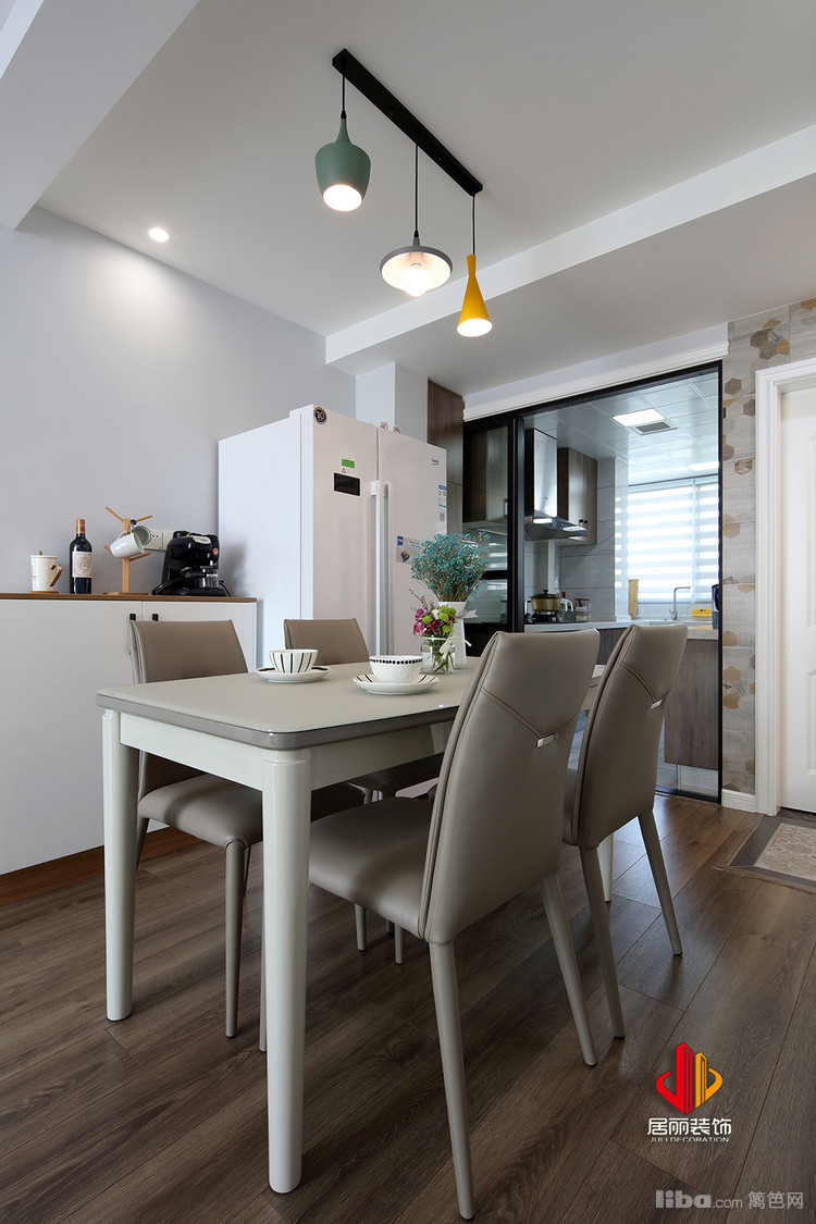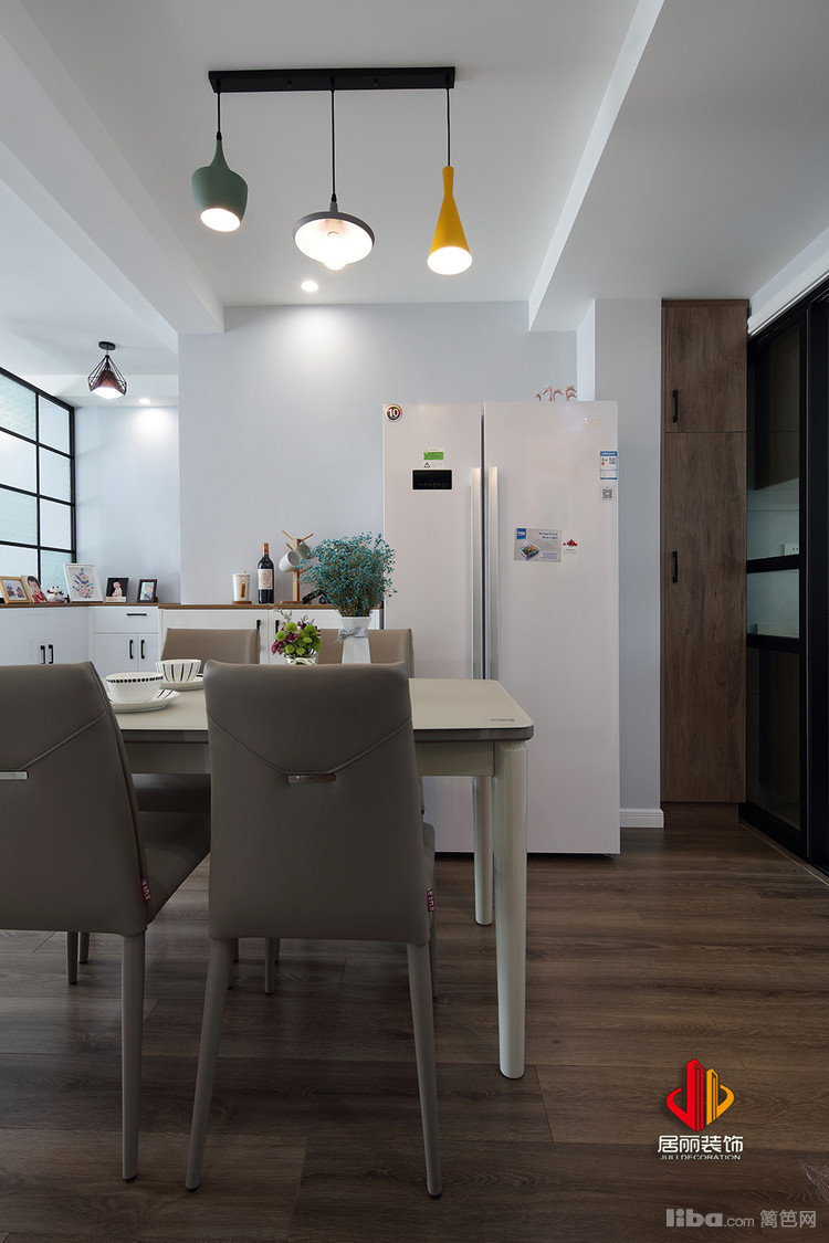 餐桌上方垂下来一排彩色吊灯,为这个空间带来一丝灵气。