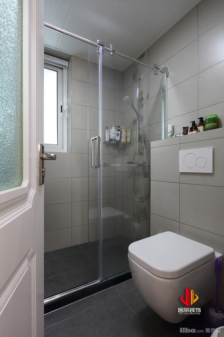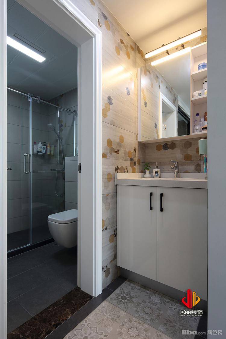 墙面和地面主体采用贴了同色系的米灰色哑光砖,搭配彩色的几何花砖,增加视觉观感,让空间不至于单调。
