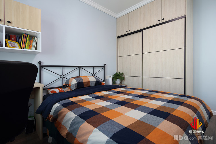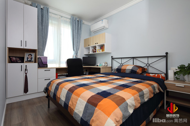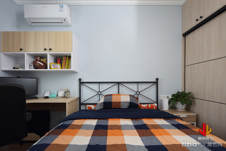 原木色的转角大书桌拼接白色的柜门,木色与白色的经典组合,搭配质感的黑色哑光金属儿童床。