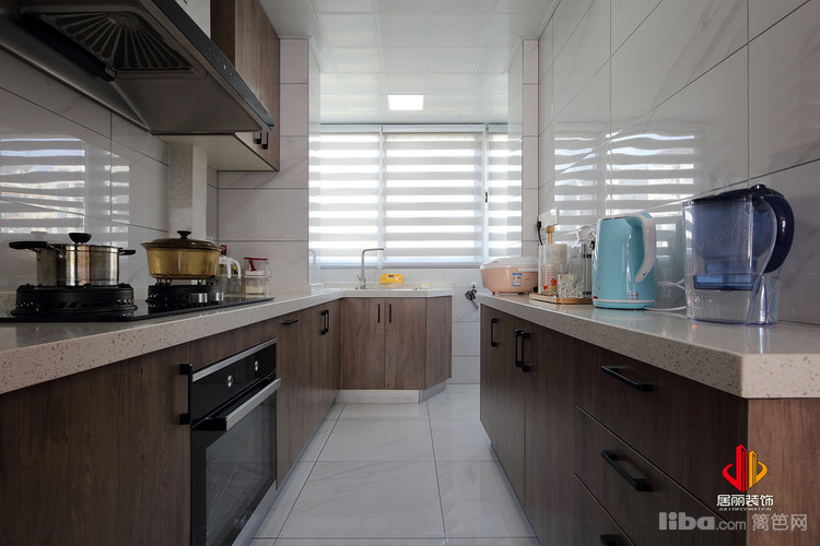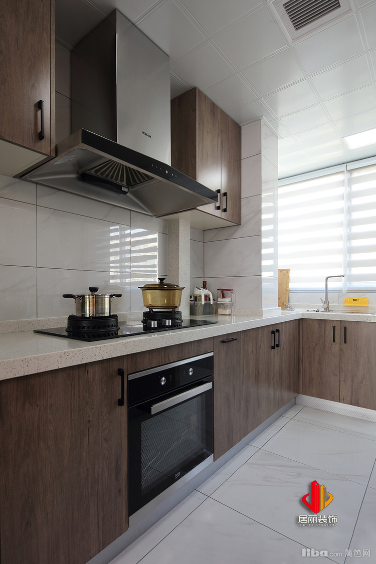 厨房的橱柜是木色的双饰面板,搭配爵士白墙地砖,整体简单干净。