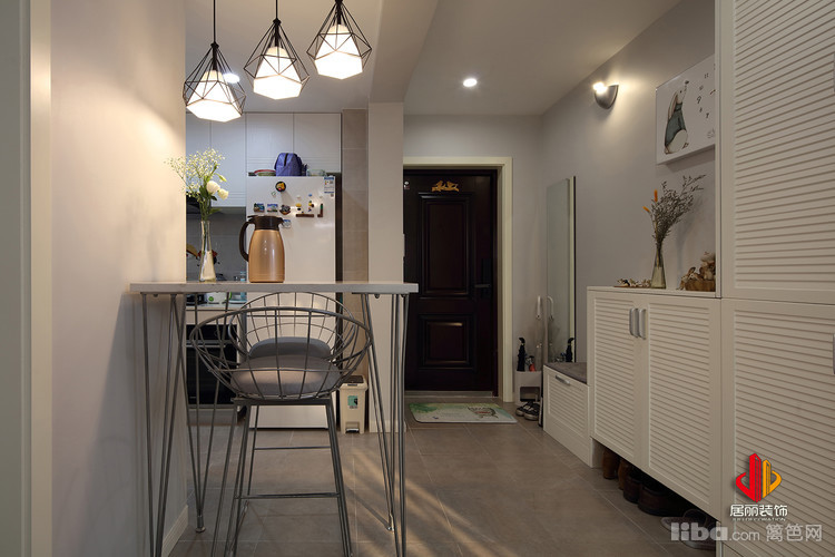 厨房比较小,放冰箱都成问题,所以做敞开式厨房,并且借烟道位置,利用吧台,满足厨房正常的功能,同时进门视线改的开阔。