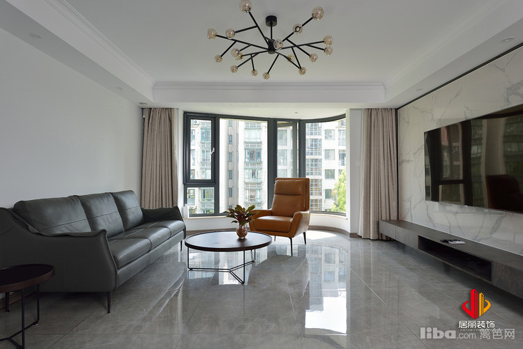灰色的真皮沙发搭配圆形简约铁艺茶几,以减少视觉负担。