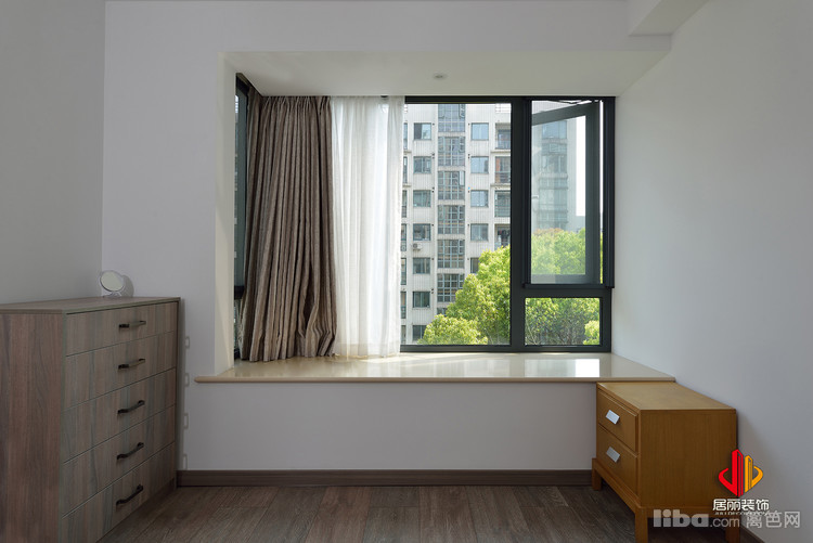 主卧木饰面的运用把握整体空间的温度,增添了自然的质感;飘窗的设计保证了卧室的采光度。