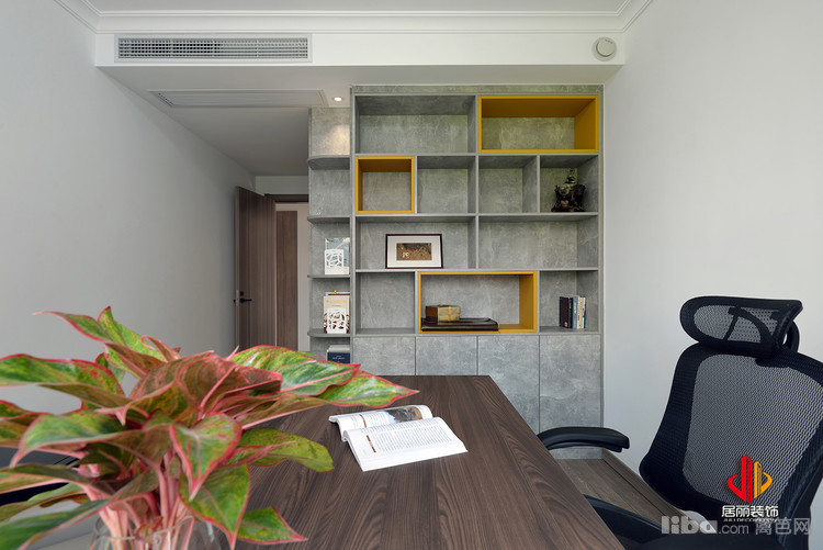 书房的书柜延续了客厅和餐厅的风格;整套房子安装了中央空调,节省空间的同时美观又大方。