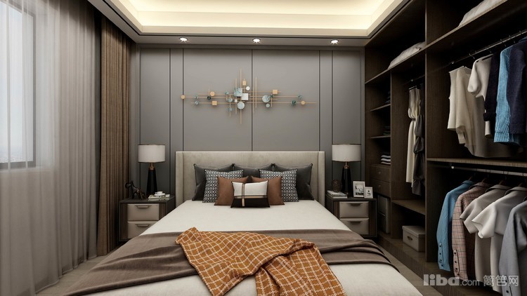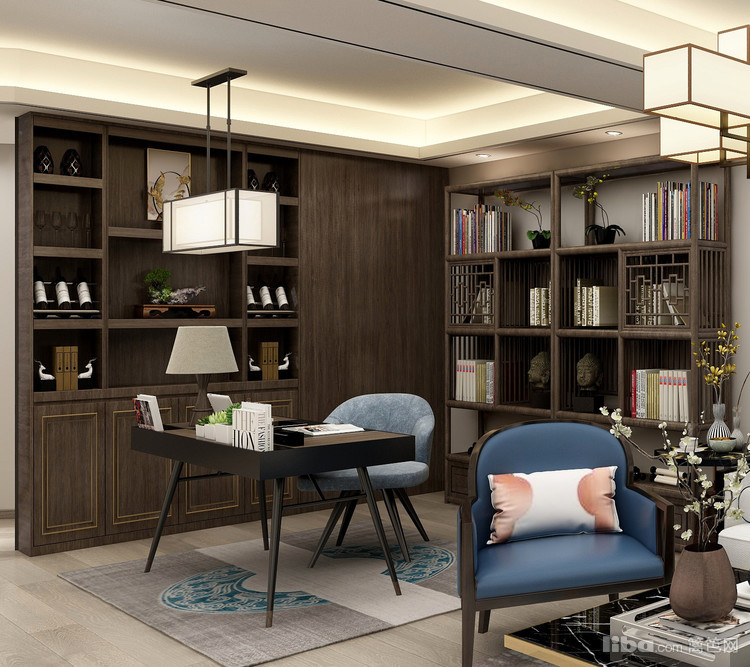 背景墙中式屏风,不是花鸟的繁乱,而是群山叠峦的宁静致远,色彩素雅,打造舒适感细节处可以看出,业主似乎尤为喜欢中式元素,布艺用品皆选用中式花纹。