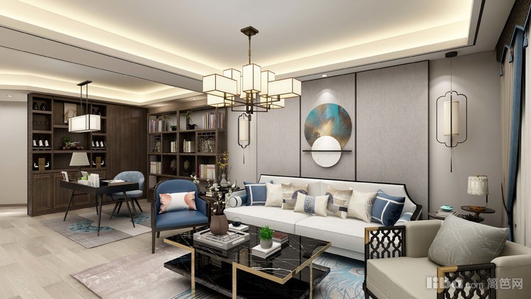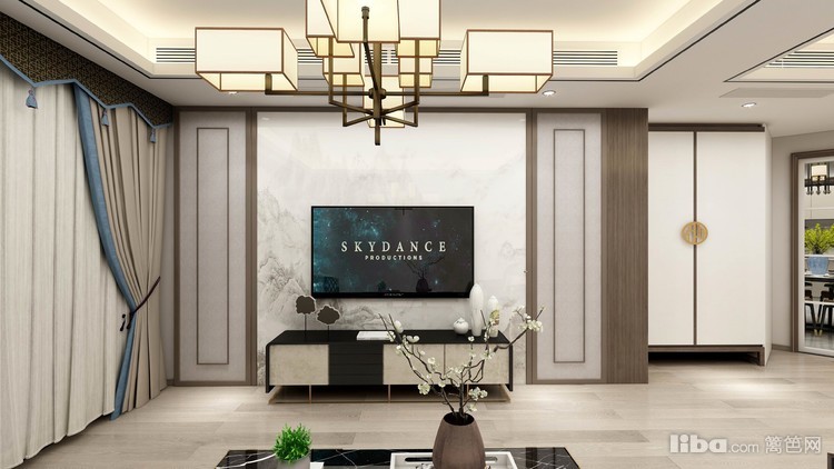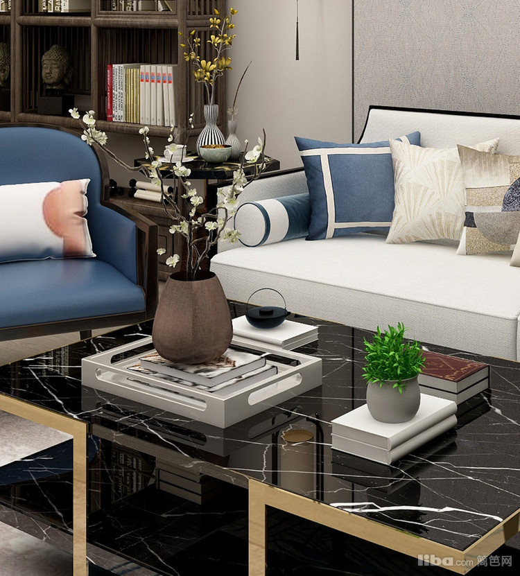 大理石与金属搭配,打破新中式的沉闷,张扬现代时尚与朝气。沙发背景墙以素色为主基调,只以线条装饰。