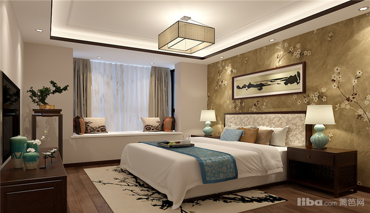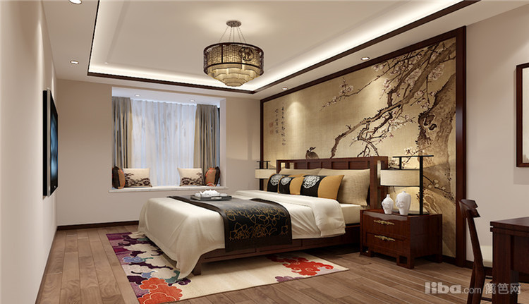 优雅新中式卧室总是给人一种宁静致远的感觉,简约的家具线条搭配繁花似锦元素,背景墙与大地毯充满艺术气息,尽显雅致。