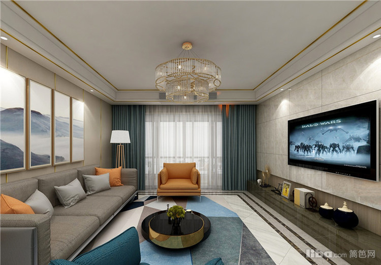经典的橙、蓝撞色搭配,充满了气质风,让人赏心悦目。沙发和电视柜都是长直线的设计,简约之余不占有过多空间。