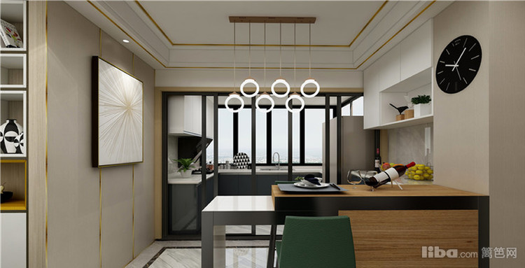 厨房外有一个开放式的多功能区域,可以用来做两人用餐区,也可以作为饮酒谈笑的会客区,小吧台满足的在家中把酒言欢的需求。