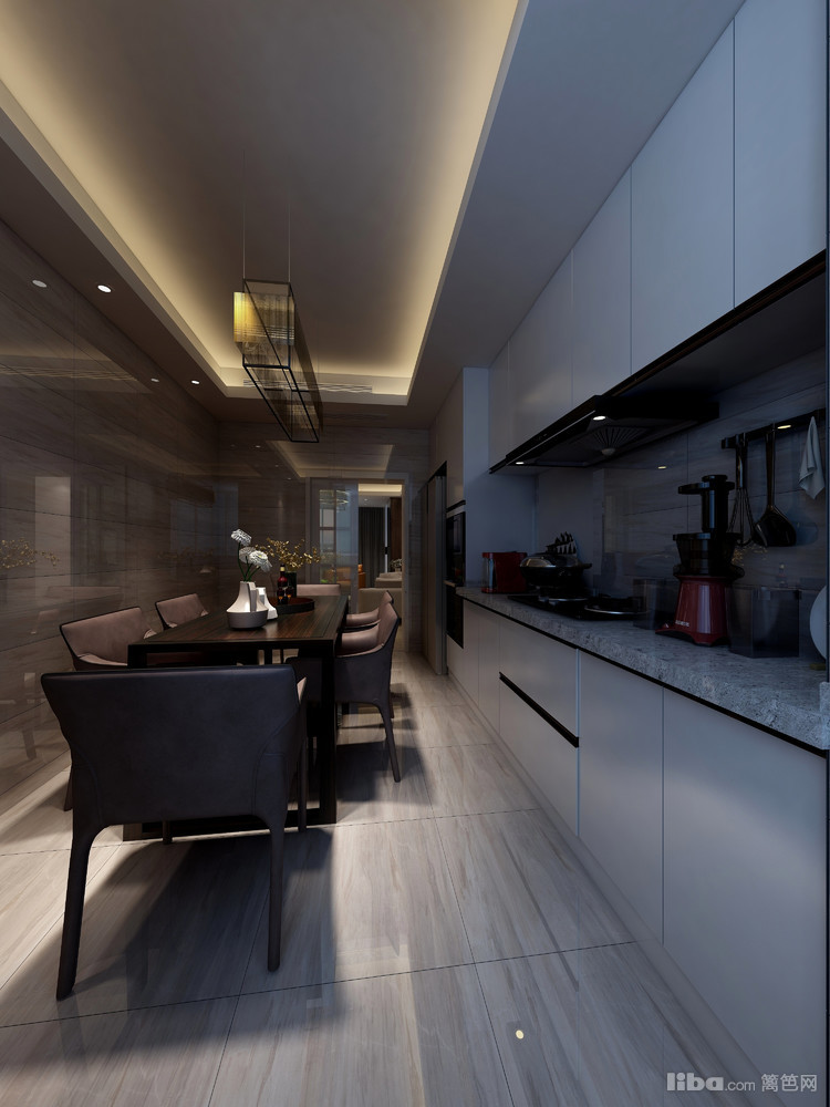 餐厅与厨房采用一体化设计,一字形厨房台面与定制柜,极大提高了空间利用率。长形餐桌既能满足一家三口平时需求,还可以留出一些过道,视觉上有了拉伸的效果,让整个空间看上去不显拥挤。