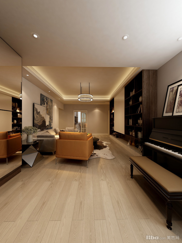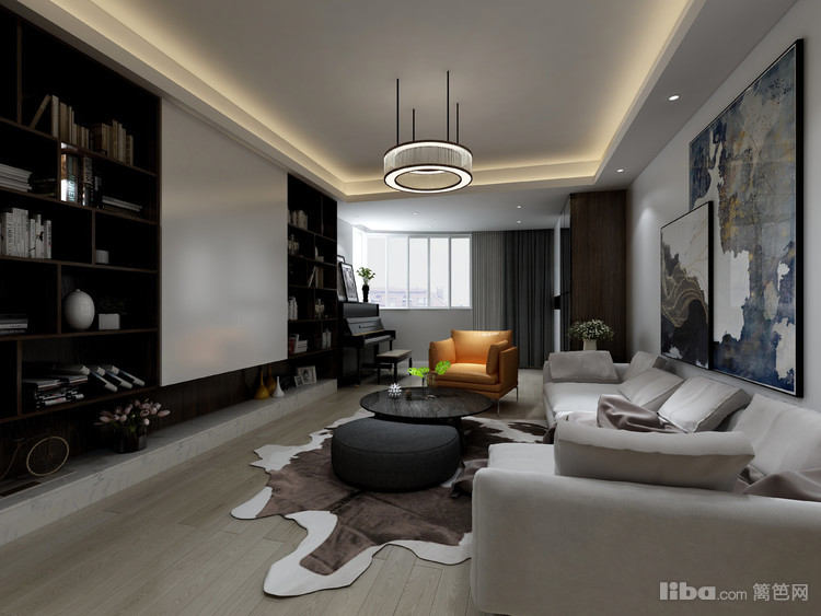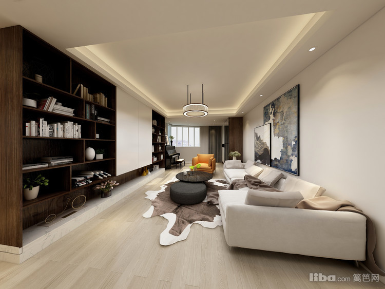 静谧的客厅是业主倾向的氛围,设计上也遵循了业主的服务需求。大面积的书柜,让爱读书的业主能够将大量的书籍得以收纳整齐。