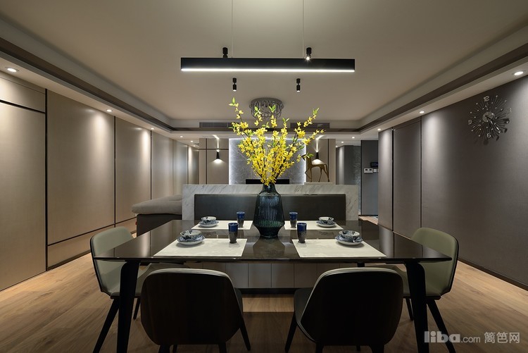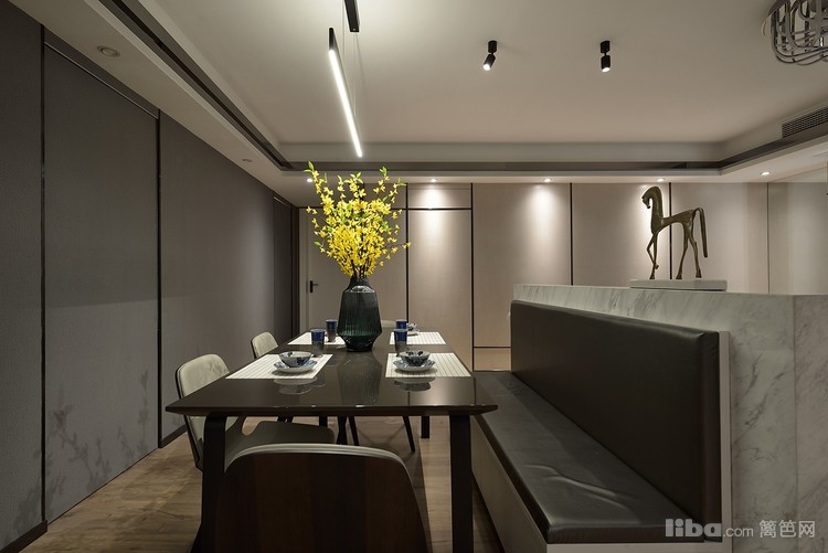 客餐厅一体的空间,以大理石背景板隔开两个区域。大理石隔断同时被做成了卡座,这样可以省去一侧的餐椅。
