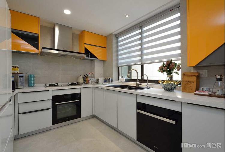 不同于客餐厅的区域,厨房采用的是白色搭配靓丽的橙黄色。跳跃的色彩可以提高烹饪者的愉悦度,更享受在此的工作。