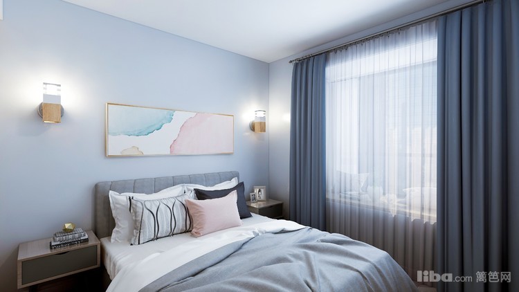 卧室灰色简约床品搭配素雅挂画与浅灰色背景墙,洋溢着清新与自然气息。