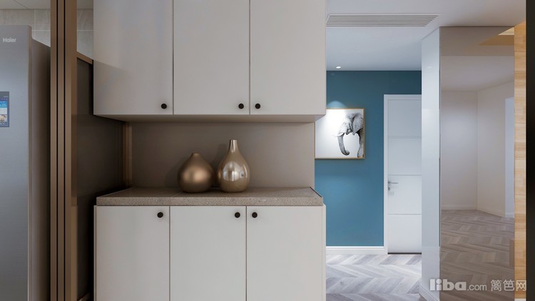 入户正对面是一个定制收纳柜,中间凹槽处放置着两个金色花瓶,颜色上与墙面上的金边画框相呼应。
