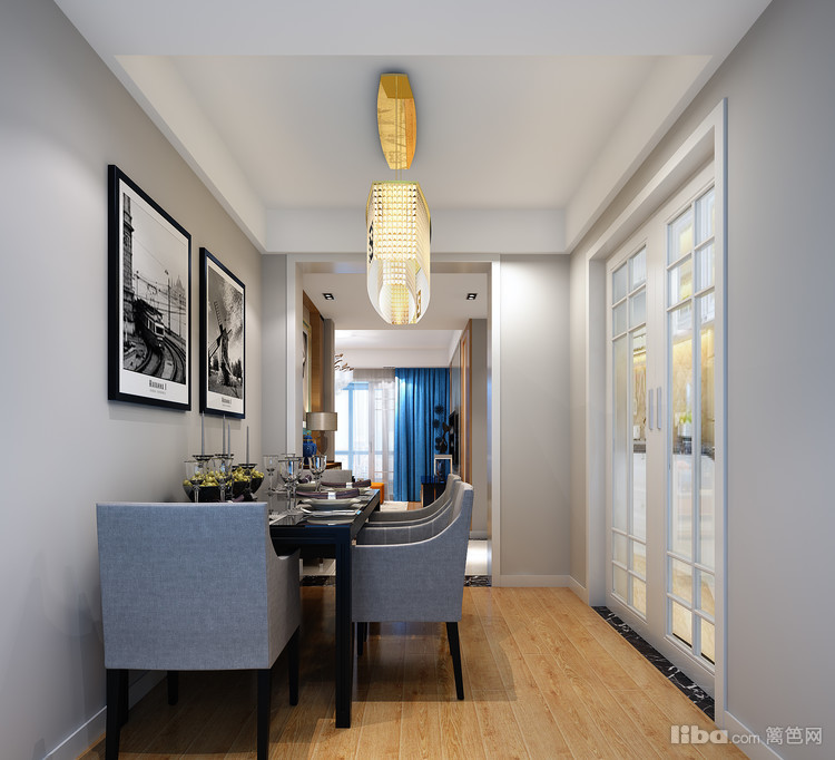 厨房与餐厅以玻璃门隔开,小小的餐厅区域,桌面靠墙,长形餐桌搭配3面4椅的摆放,满足了一家人的就餐需求的同时,还能节约空间。
