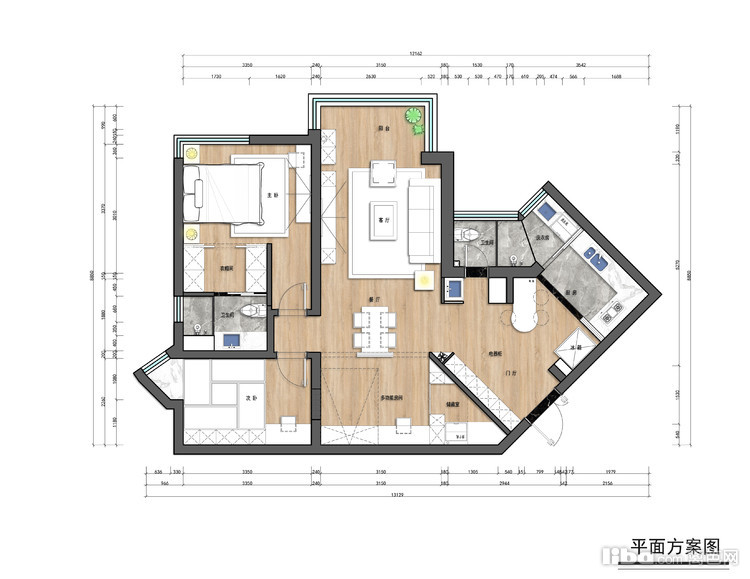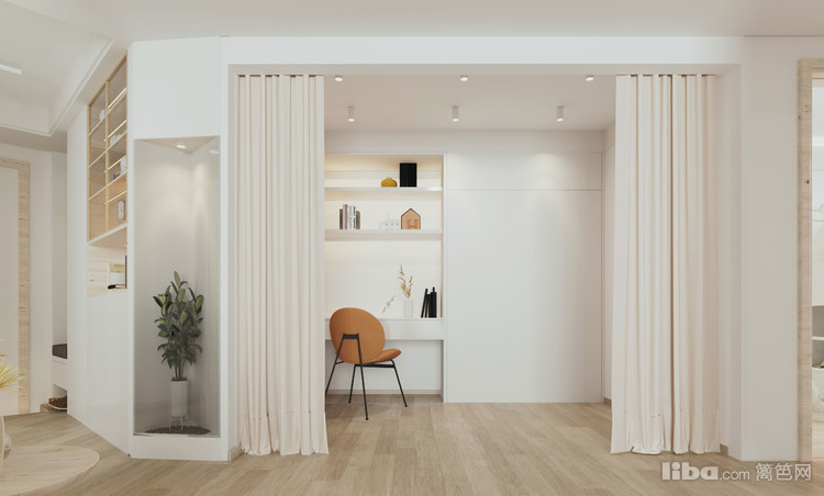 考虑到梯形的特殊性,这个空间被用作多功能区。作为储藏室、书房皆可,拉上窗帘,就成了一个独立的静谧空间。
