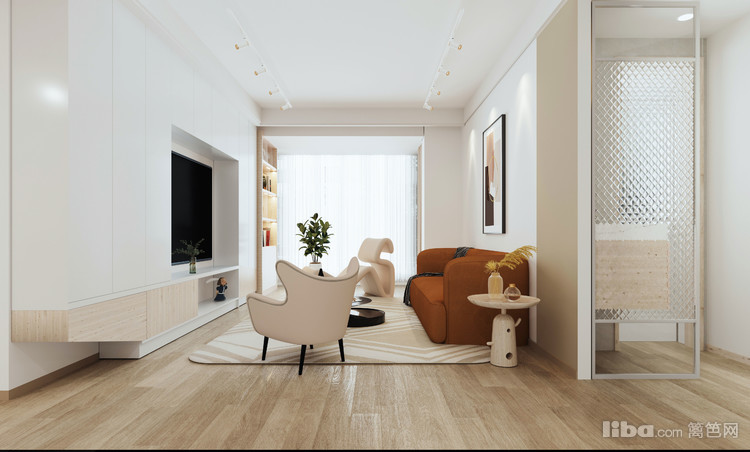 白墙、白柜与实木搭配,看上去很是清爽。异形沙发椅、立体收纳柜,增加家具的趣味性。借阳台两侧改造成小型的书架,增添文艺气息的同时,让客厅空间在视觉上有放大的效果。