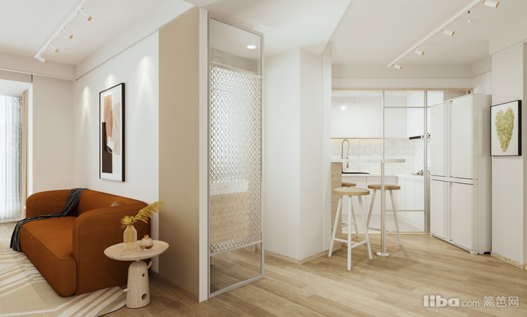 为了让空间看上去更宽敞、通透,屋内的隔断尽量选择玻璃材质。小巧的厨房一应俱全,厨房外是一个小型的吧台,可以用来处理菜品,也可成为一个小型的餐桌。