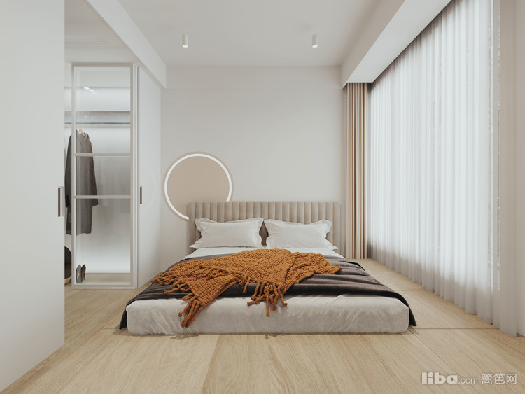 主卧自带一个步入式衣帽间,无隔断设计让整个空间更显敞亮。床铺选择了榻榻米,重心低会给人一种安全感。
