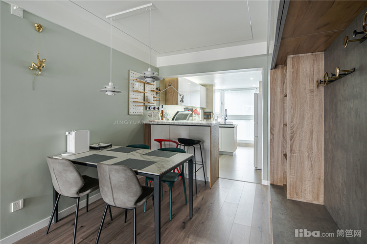 装饰性餐边柜与墙面形成拼接设计,搭配白色高低吊灯,从颜色上打造了空间层次感。