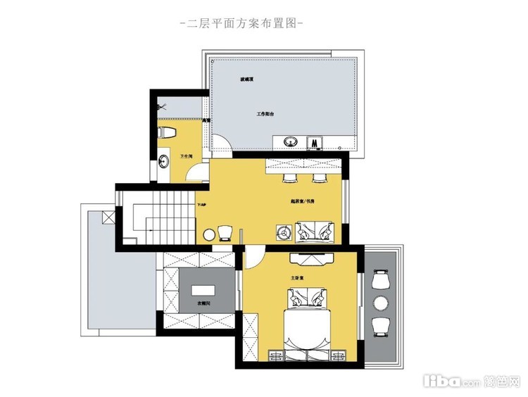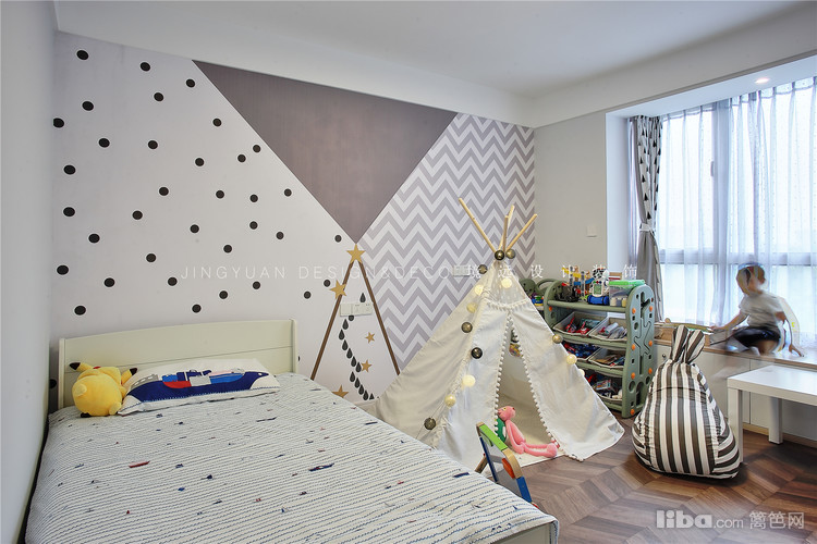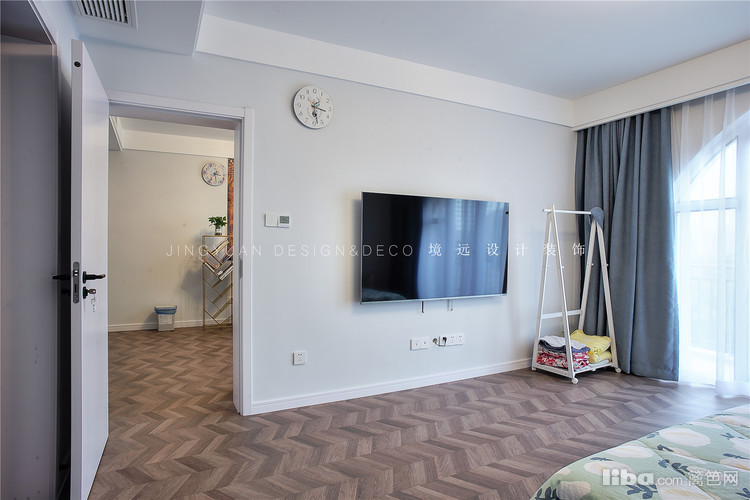 主卧使用的是暖灰色调,地面同样延用了鱼骨拼地板,相互呼应,整体性更强。拱形窗的设计也给整个空间带来了充足的光线,丰富了空间内容。