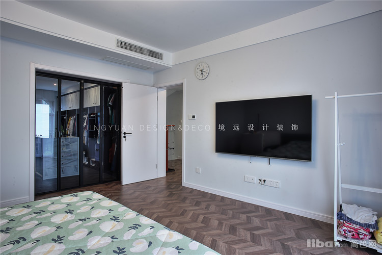 主卧使用的是暖灰色调,地面同样延用了鱼骨拼地板,相互呼应,整体性更强。