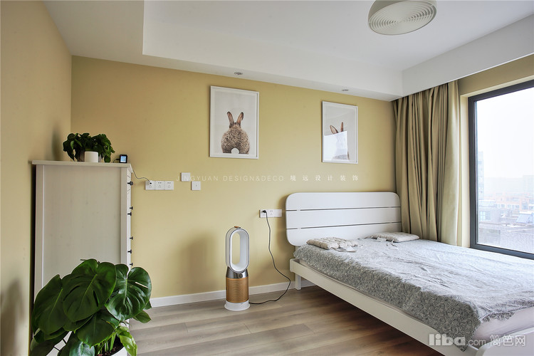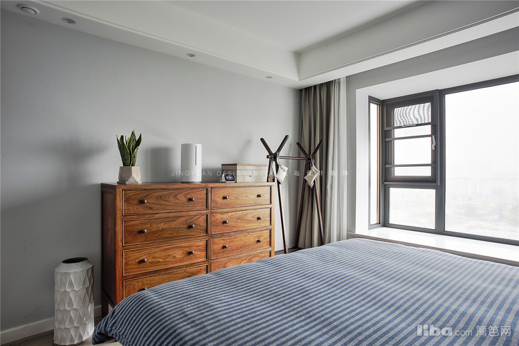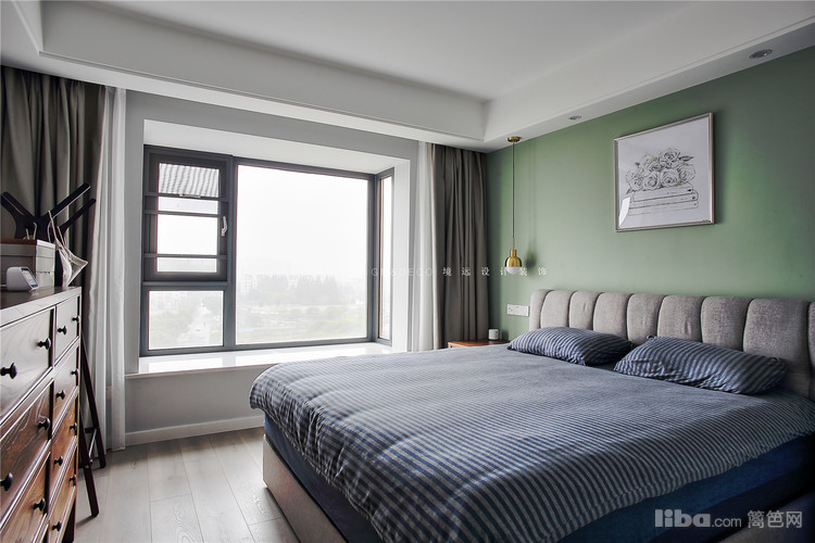 主卧简洁有序的空间布局,不掺杂一丝累赘的块面,淡绿色的背景墙配上竖条的软垫,增添了卧室的情趣的同时,将色调美学和空间质感完美做了平衡。