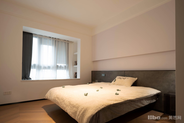 主卧从隐形门进来,左右两边布局,左手边是睡眠区,悬浮床和岩灰色半高床头背景墙,造型感强。