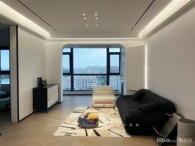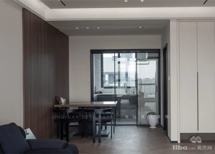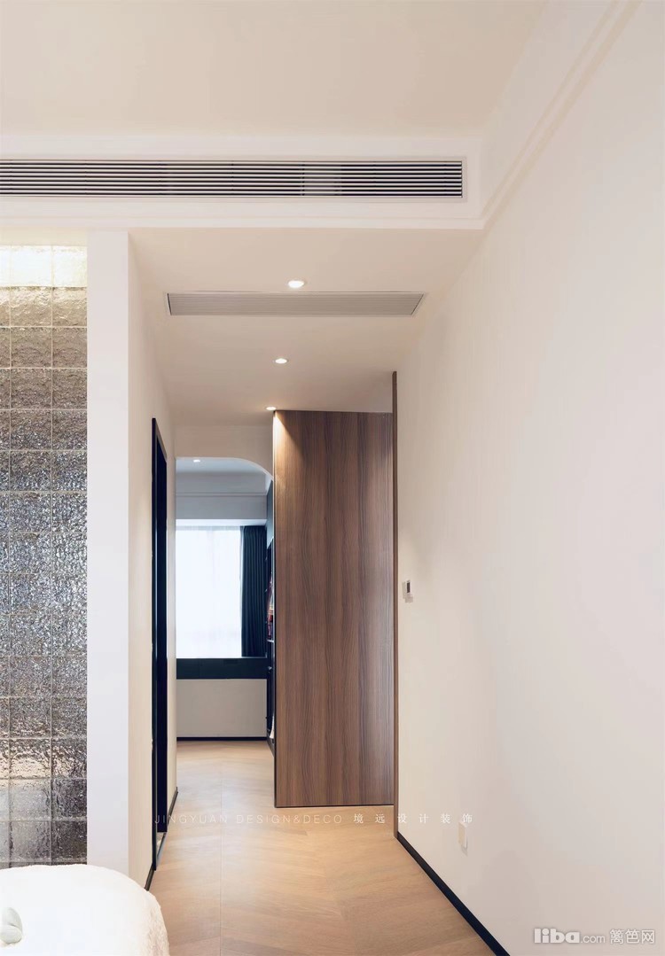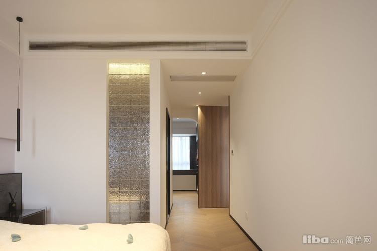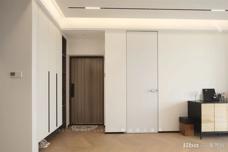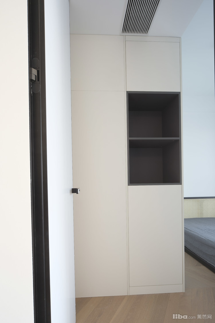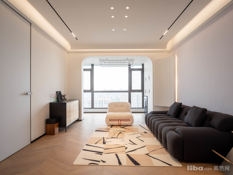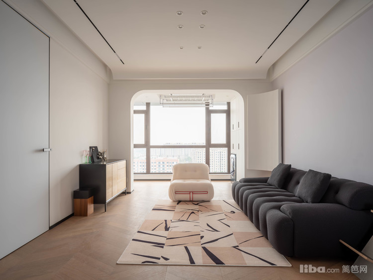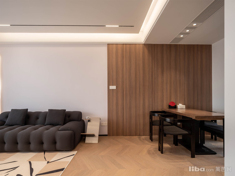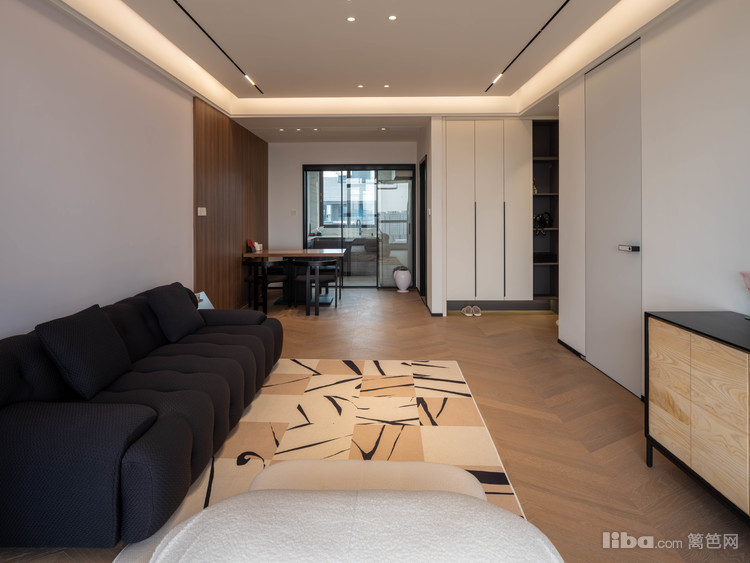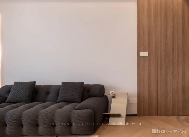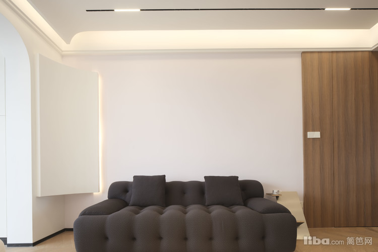 业主平常很少看电视,所以客厅不设计电视背景墙,正好沙发对面是次卧入口,选了墙面同色系静音磁吸门