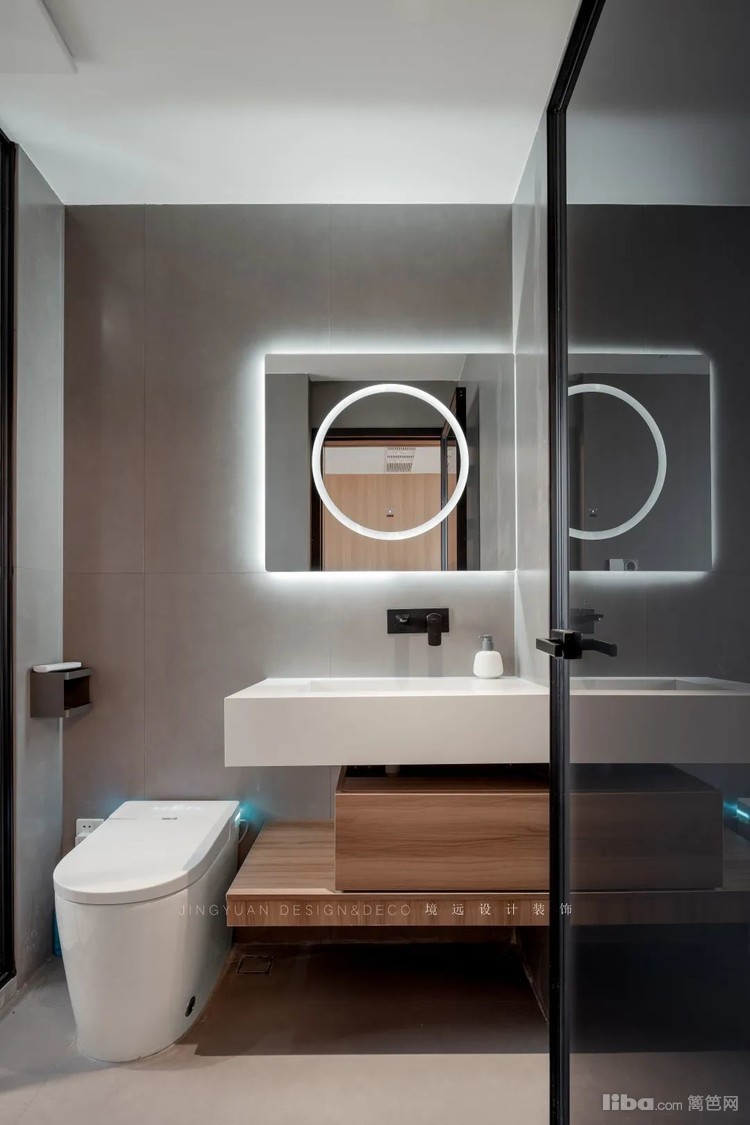 浴室柜选用白色和木色系列,延续整体风格,白色的人造石台下盆,黑色内置式水龙头,触感高级