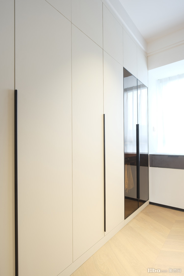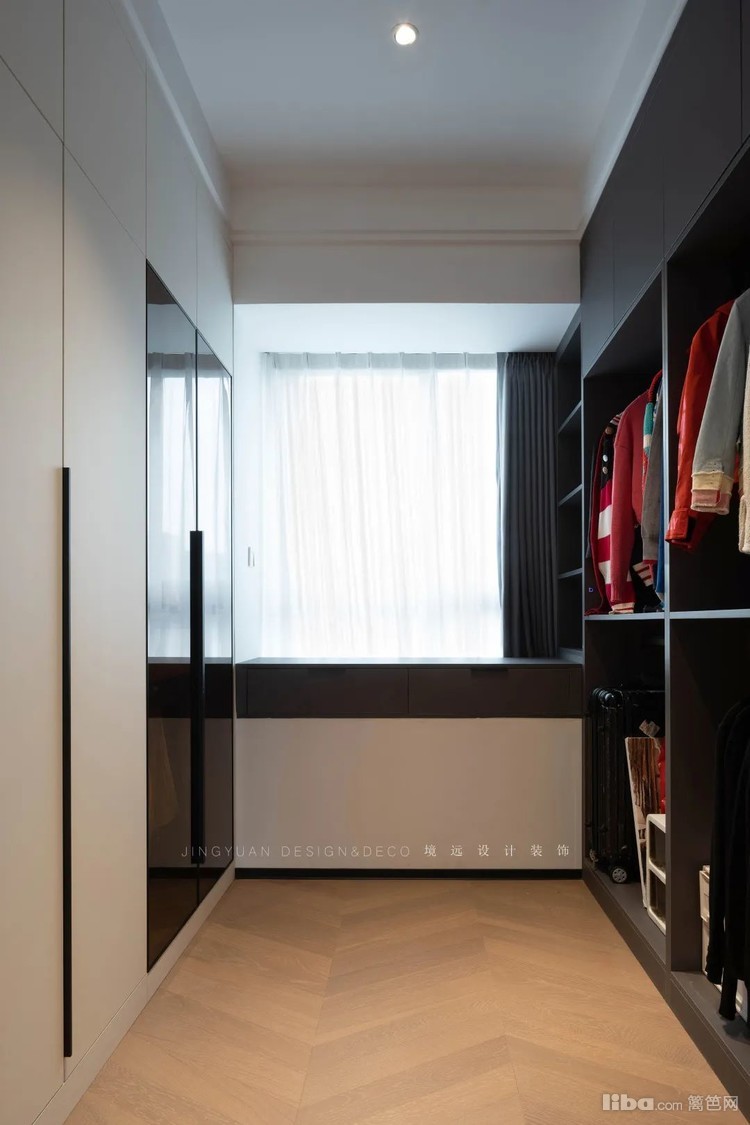 衣帽间,沿两边墙体做定制收纳衣柜,一边是开放式随拿随放,另一边是柜门款,换季衣物被褥全部收好不显乱。