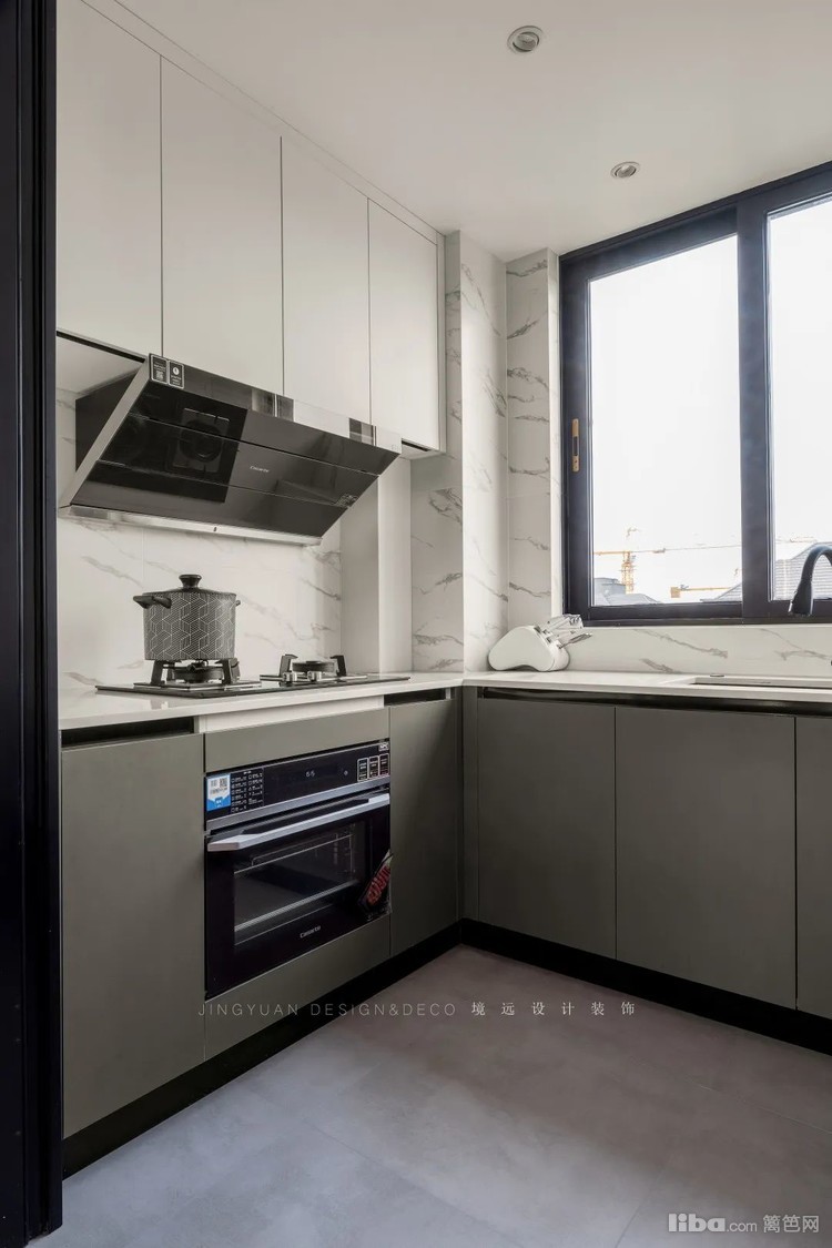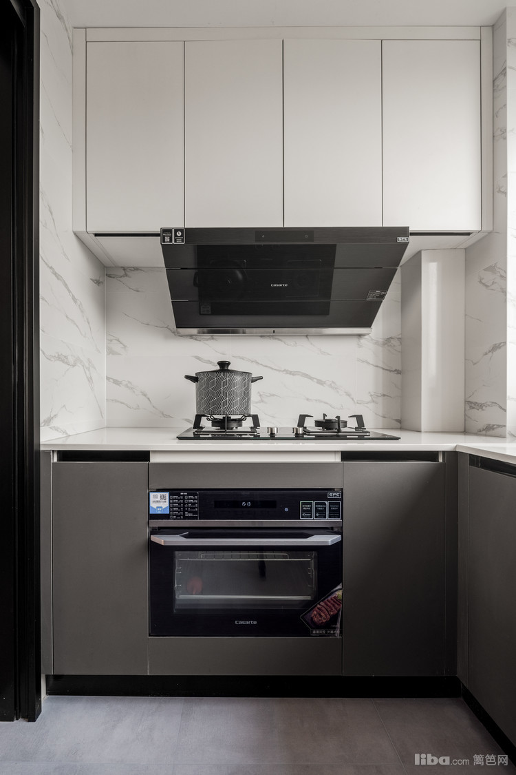 蒸烤箱内嵌,厨具都选用深色调,厨房整体的黑白色调分布均匀,上下和谐,符合现代感设计氛围。
