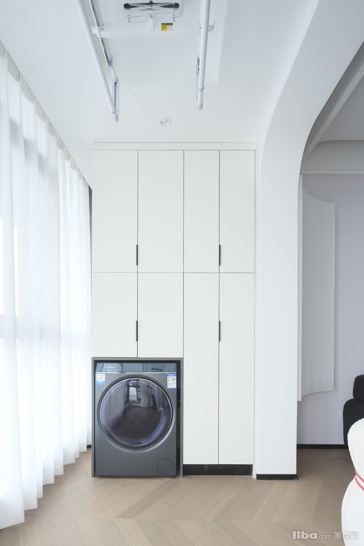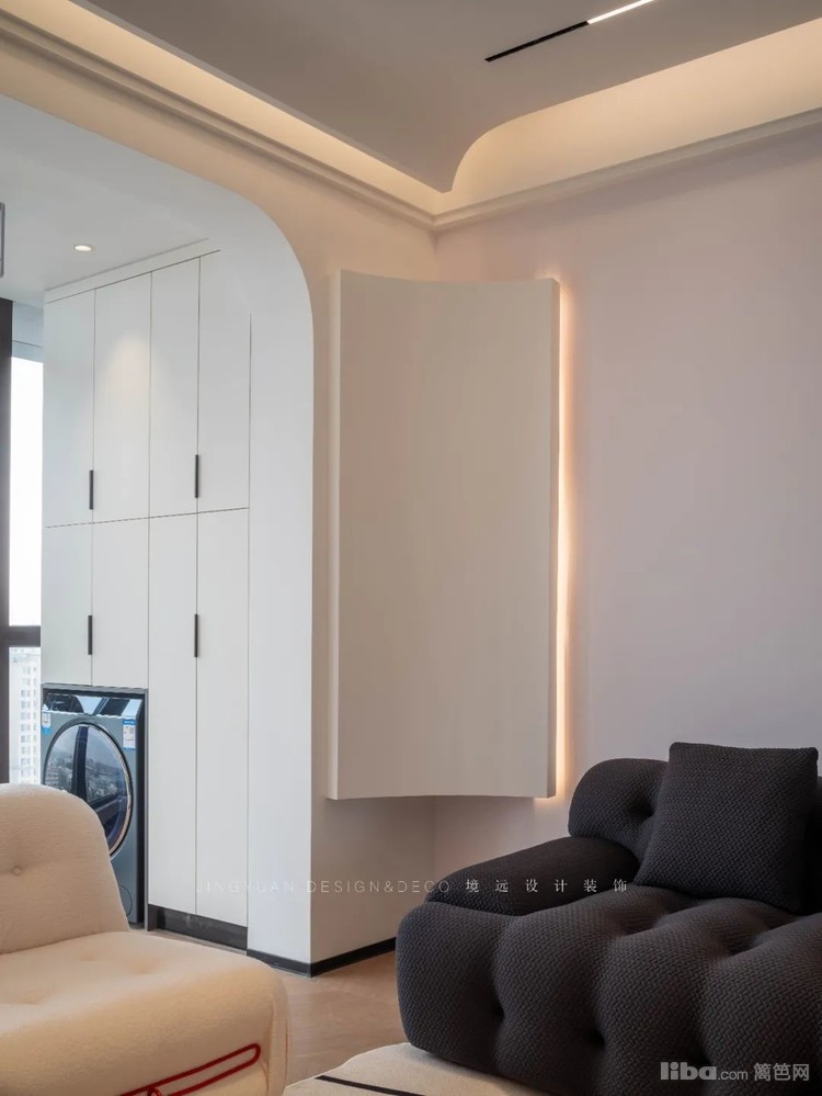 和阳台相连的背景墙处利用弧形石膏板做造型,呼应弧形的阳台拱门,空间设计感更强。