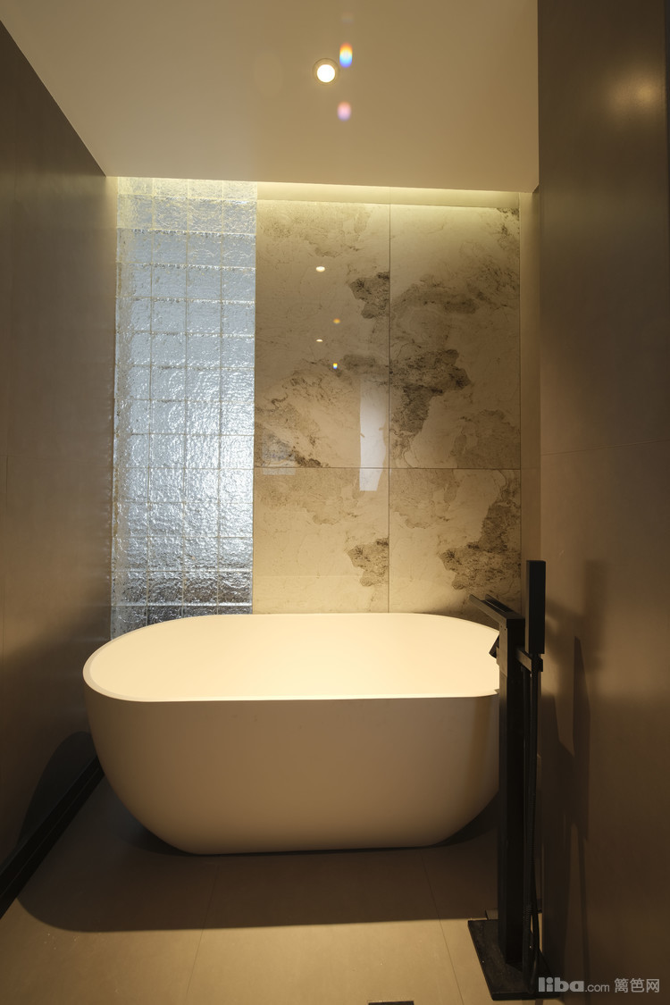 主卫设计浴缸,符合业主睡前泡澡的习惯,浴缸背景墙做玻璃砖和大理石板拼接造型,泡澡也能体验到五星级酒店的摩登感。