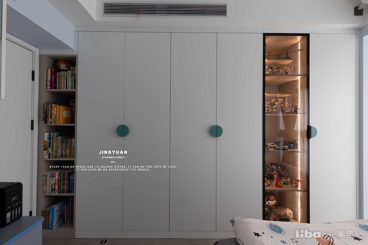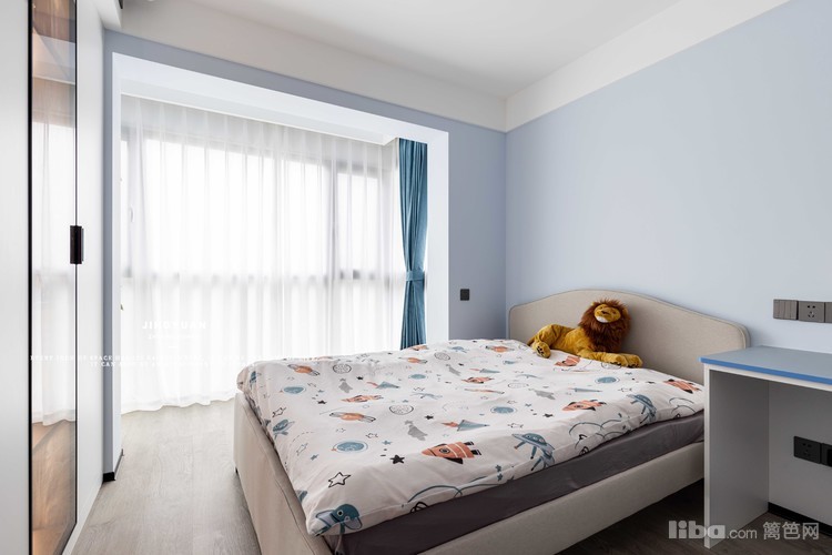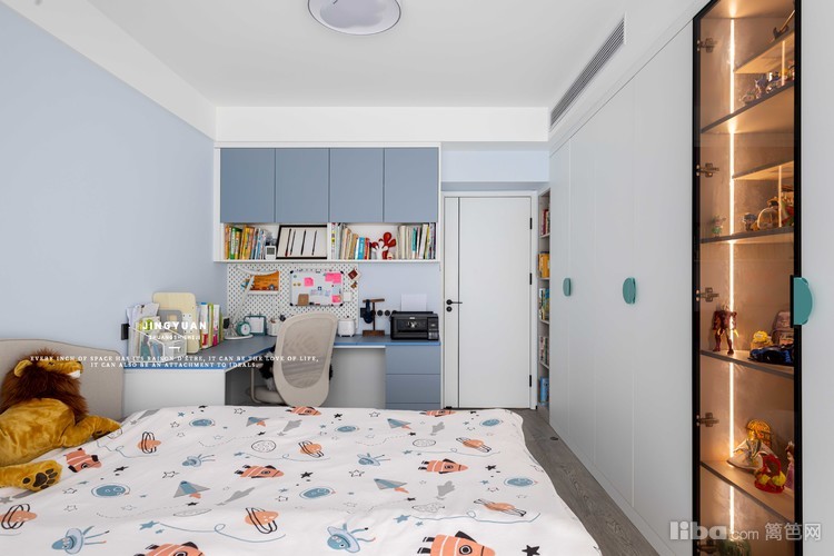儿童房以童趣蓝色为主 ,通铺到小阳台,采光更好,定制书桌连接L型柜体,书桌也兼顾了床头柜的功能。