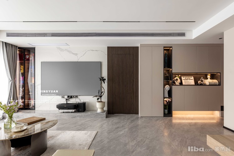 超大尺寸的幕布电视搭配整组进口音响,体现业主较高的生活品质追求。