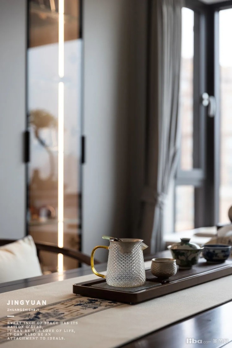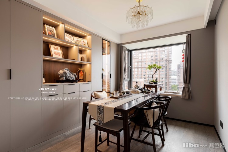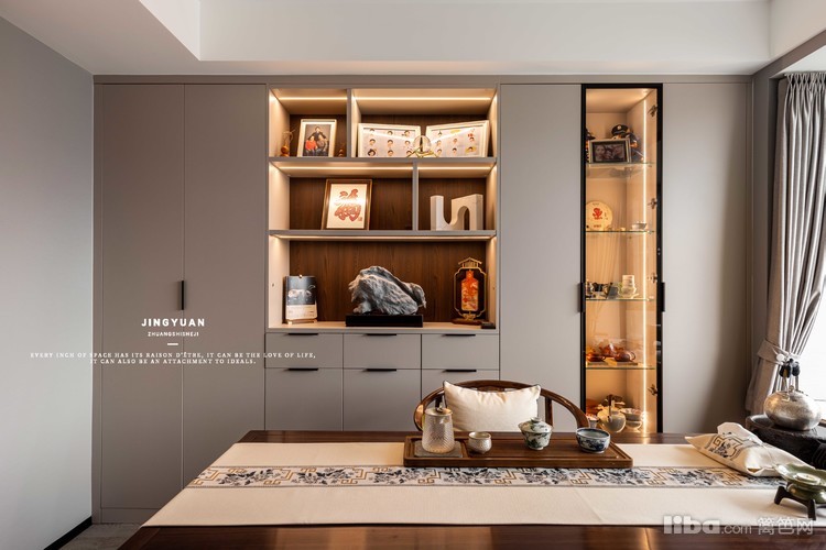 茶室作为家中待客区域,遵循了男业主的设计要求。专业木质整套茶桌椅,搭配简单的米棕色系定制柜。飘窗台作为休憩区,摆放坐垫,恰好能满足远眺放松心情。