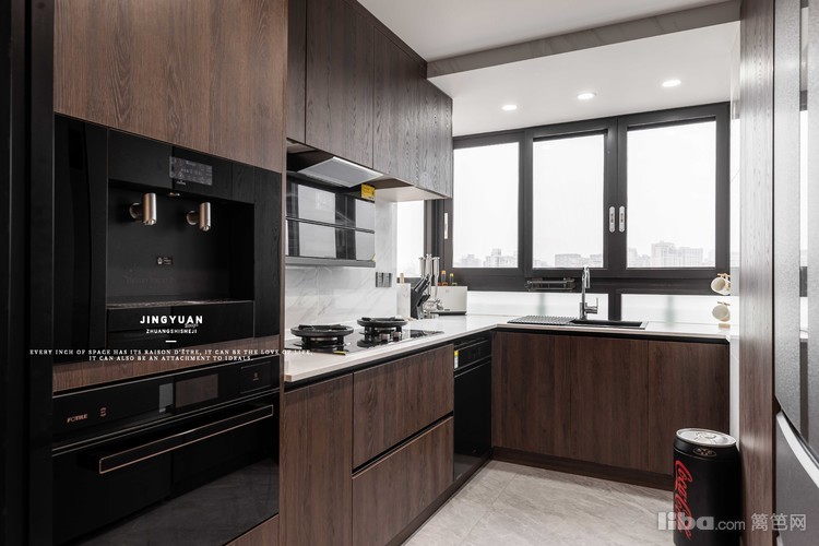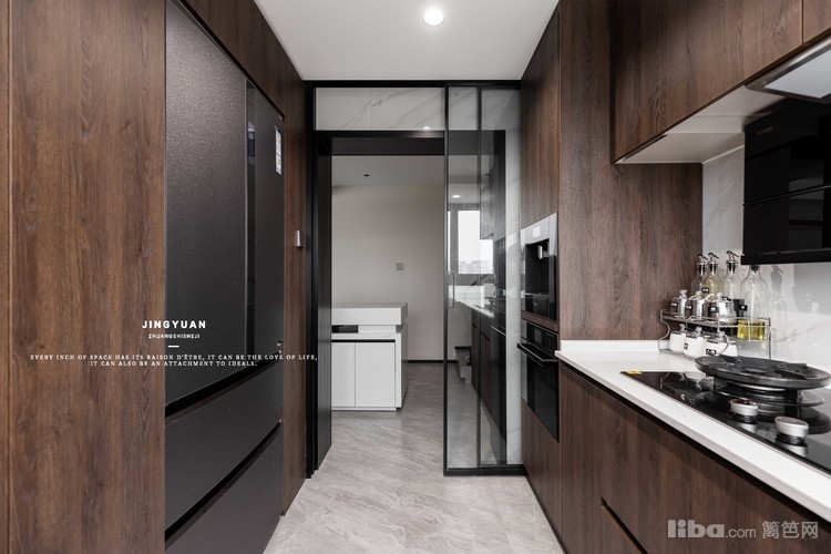 厨房整体以深色调为主,胡桃木色搭配黑色电器,定制柜完美内嵌了各种电器,冰箱、蒸烤、管线机、洗碗机等等。