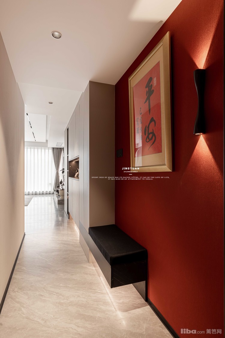 门口利用红色色彩和薄壁灯的投射灯光来达到增“亮”的需求。