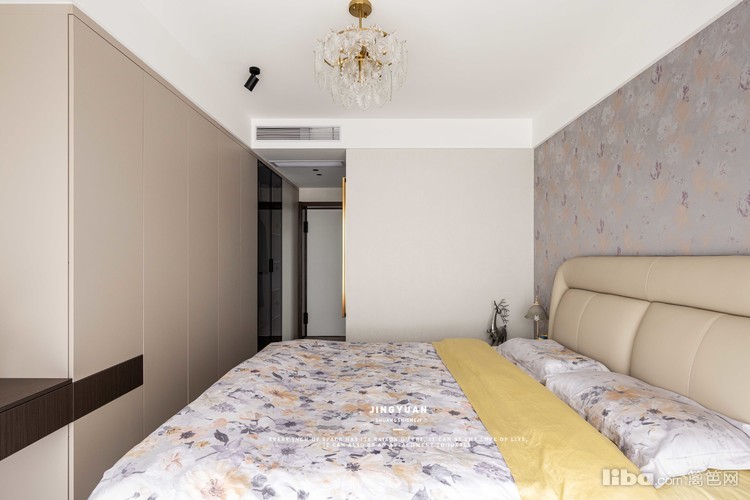 水晶吊灯和轻奢款床头柜台灯,风格统一,让卧室空间多了一丝温柔静谧的氛围感。