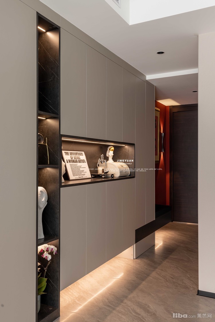 为了解决玄关狭长的痛点,设计师利用墙体顺势设计一大组定制柜,满足一家人的各类鞋收纳。