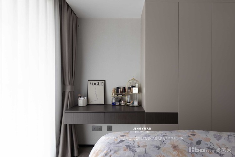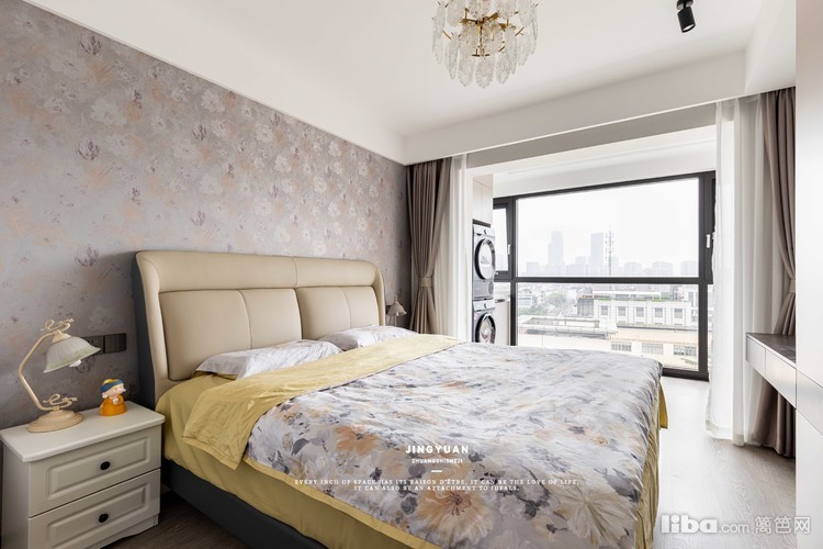 主卧背景墙是女业主特地选择的壁纸花纹,搭配上相似款式的床品四件套,整体色调十分符合。