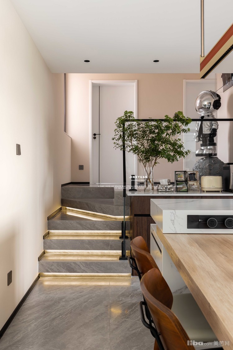 餐边柜的设计也非常巧妙。利用错层台阶的高低差,延伸出台面,底下做定制柜,完美利用户型增设一处餐边柜。
