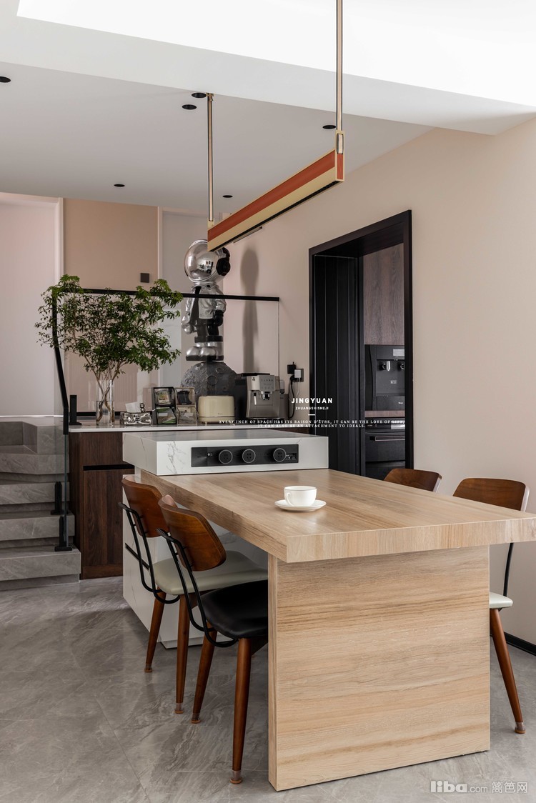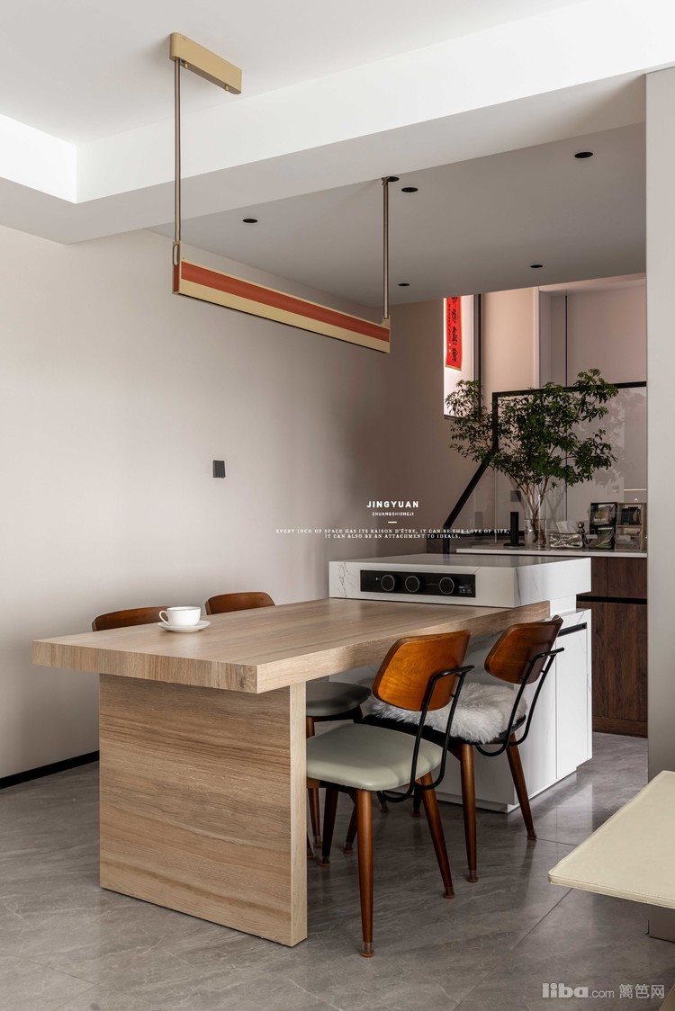 一处是餐桌材质的选择,特意寻定制了木纹的岩板用作餐桌材质。