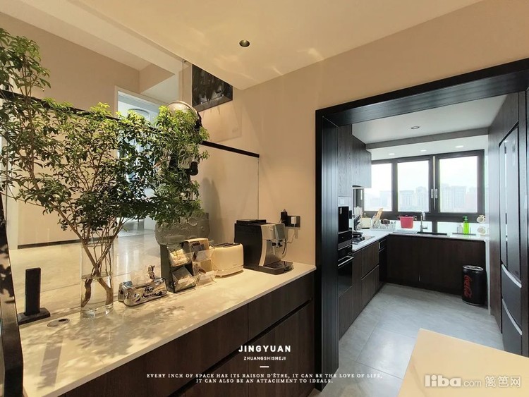 透明三联动推拉门能让厨房光线达到岛台位置,补充了餐边柜的采光,更明亮通透。